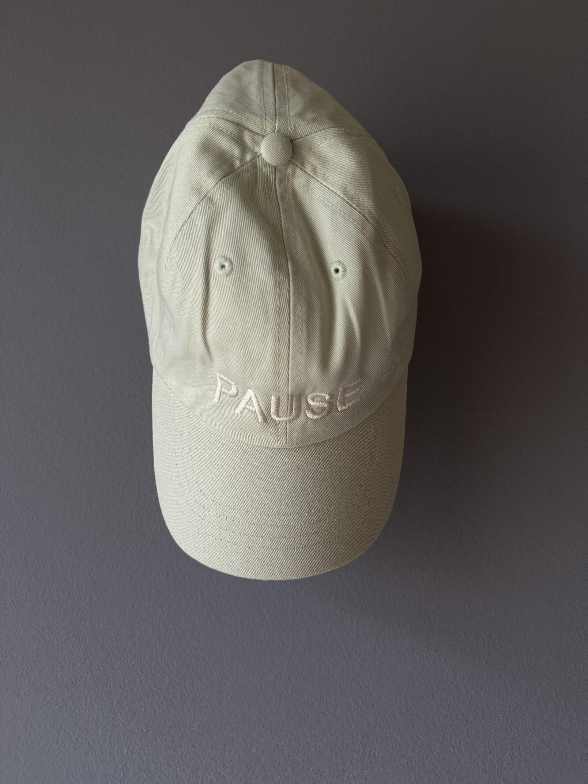 Cap in pastel mint with PAUSE embroidery 6 panel cap Curved brim & stitched eyelets Adjustable strap at the back Silver tone metal hardware 100% Cotton